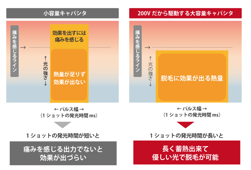 パルス幅が長ければ、優しい光で脱毛可能です。一方、パルス幅が短い場合はより強い光を照射しないといけなくなるので、痛みを伴いやすく、火傷の原因にもなります。